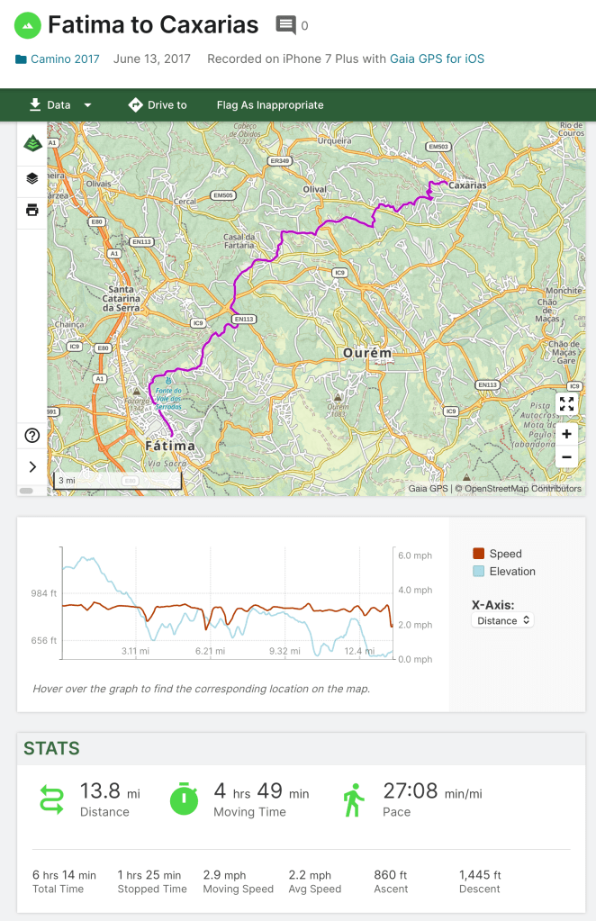 The forecast has 95°-100° for the next week each day is around 30km. Note that I am not posting from where I finished walking today at Caxarias. I’m in Coimbra. Not much cooler here but here I can do 20km walks in the morning before it heats up without missing the schedule.