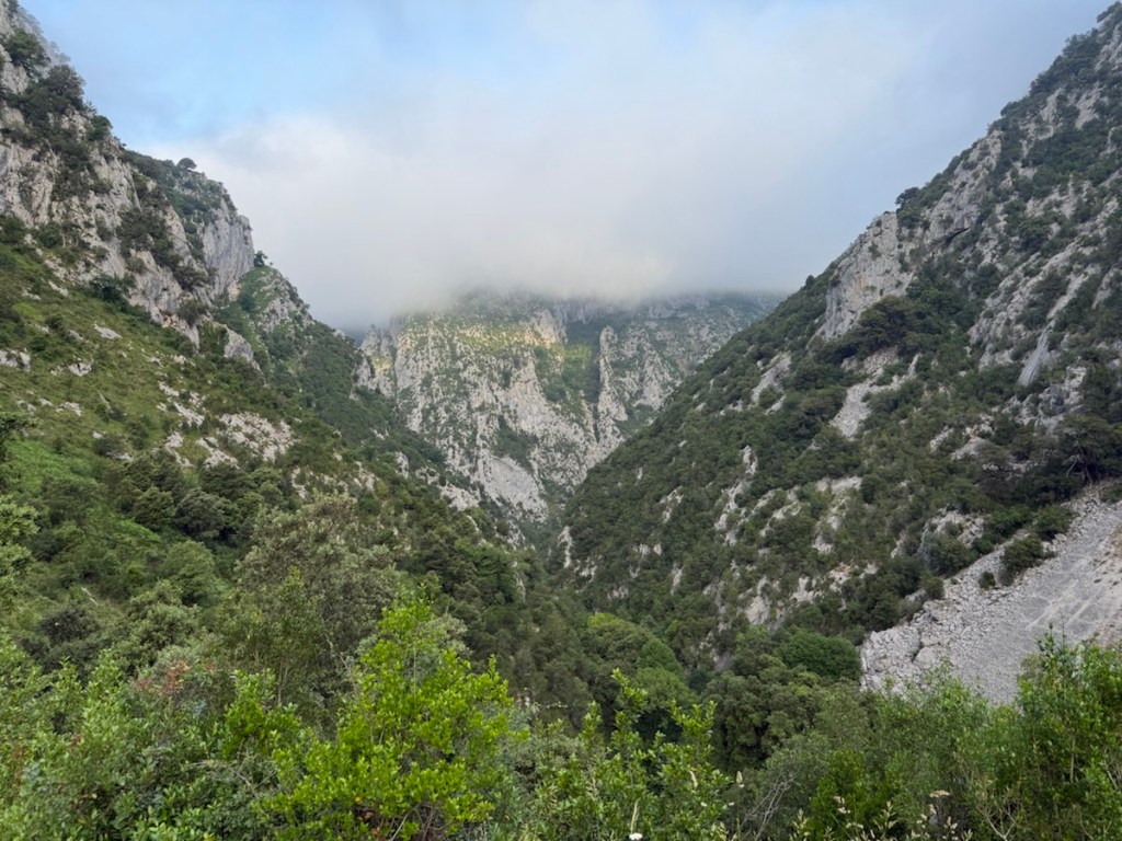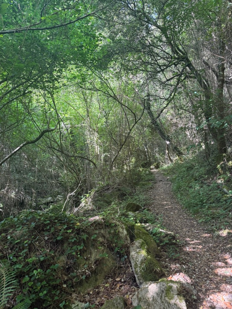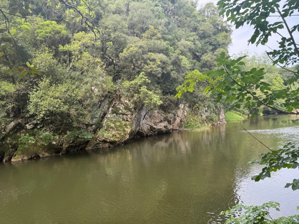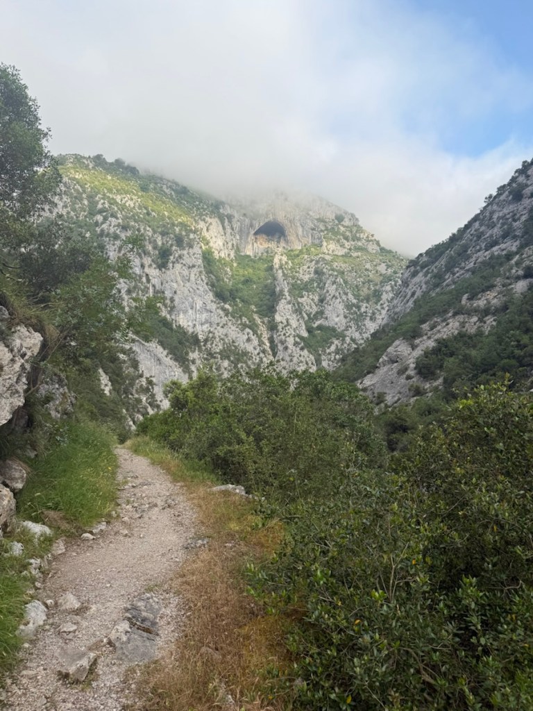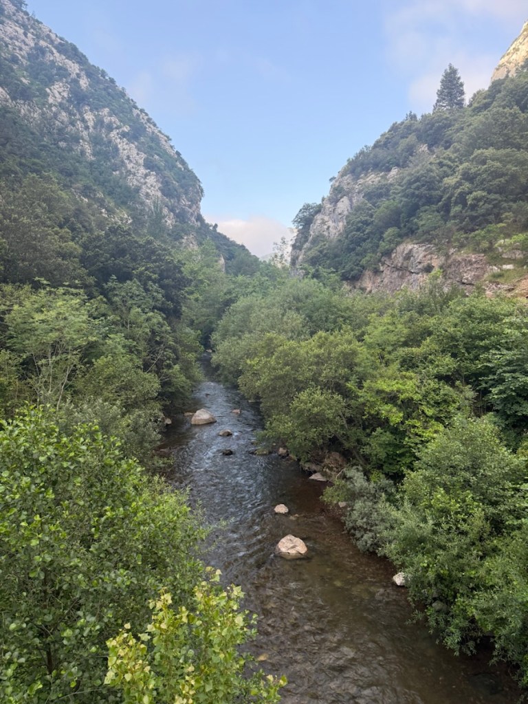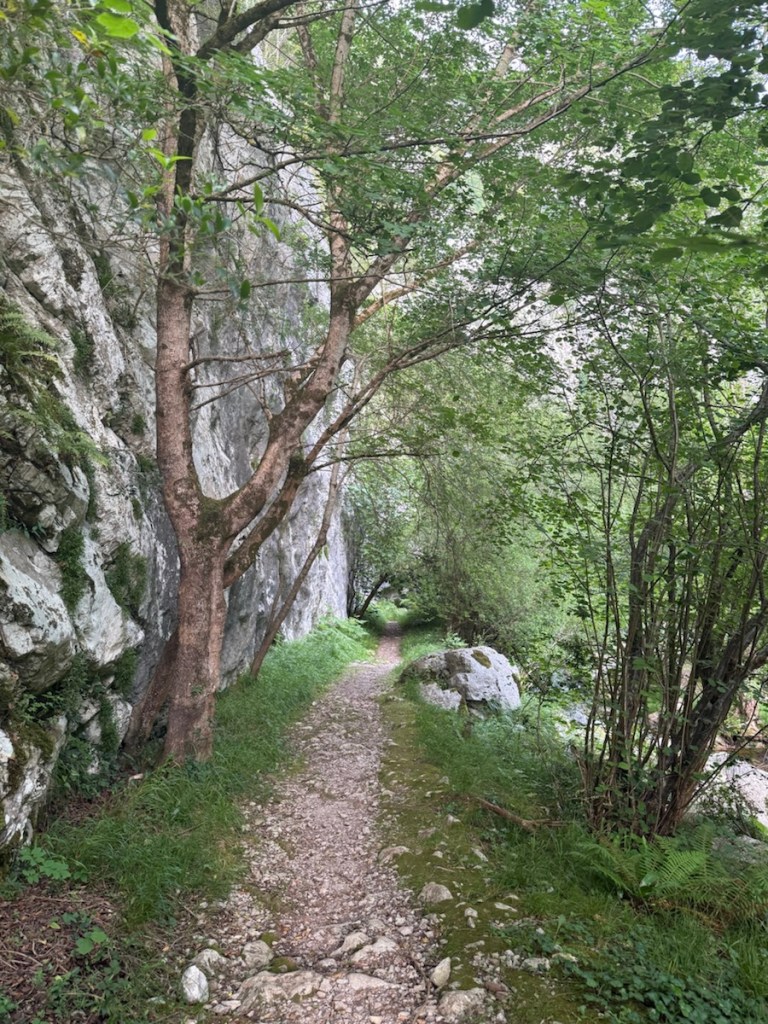 At the bottom of the canyon, the reward for my accidental detour was a quiet 3-kilometer stroll alongside a clear river, dwarfed by the limestone peaks of the Picos de Europa. The morning light played tricks on the cliffs, and for a moment, one of the benefits in this case of a route deviation was that I didn’t have to climb 400 meters and my route was shorter by multiple kilometers.