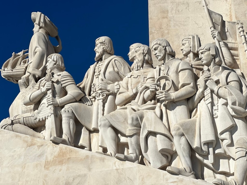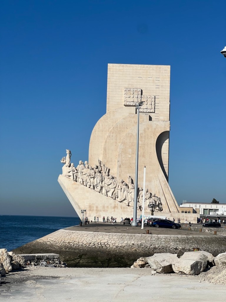 For our final day, we decided to head to Belém, about 10-12km from Lisbon, along the coast. Instead of taking the metro or trolley, we opted for e-scooters. After a thrilling 40-minute ride, we arrived at the Monument to Vasco da Gama, who set sail from here in search of a westward route to India, accidentally discovering Brazil along the way. The monument is a modern, concrete structure vaguely resembling a ship’s bow, with Vasco da Gama and his crew looking out toward the unknown.